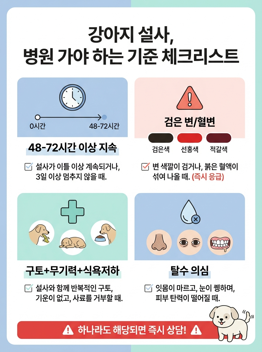 강아지 설사는 흔하지만, 지켜봐도 되는 설사와 바로 평가가 필요한 설사를 구분하는 기준이 중요합니다. 핵심은 간단합니다.