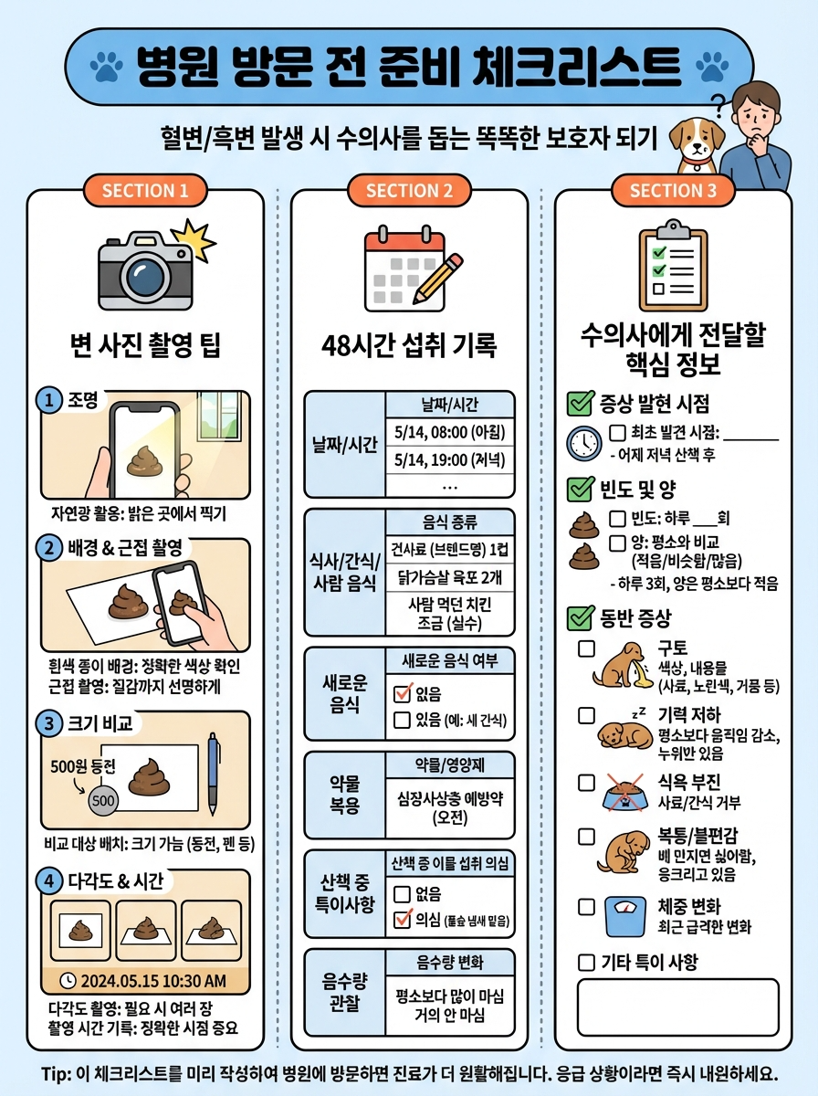 - 변 사진 촬영: 말로 설명하는 것보다 한 장의 사진이 훨씬 정확합니다. 변의 색, 질감, 점액 유무가 잘 보이도록 촬영하세요. 가능하다면 변을 지퍼백에 소량 담아가는 것도 좋습니다.