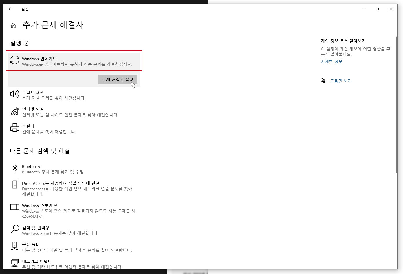 설정 → 업데이트 및 보안 → 문제 해결 → 추가 문제 해결사 → Windows Update → 실행