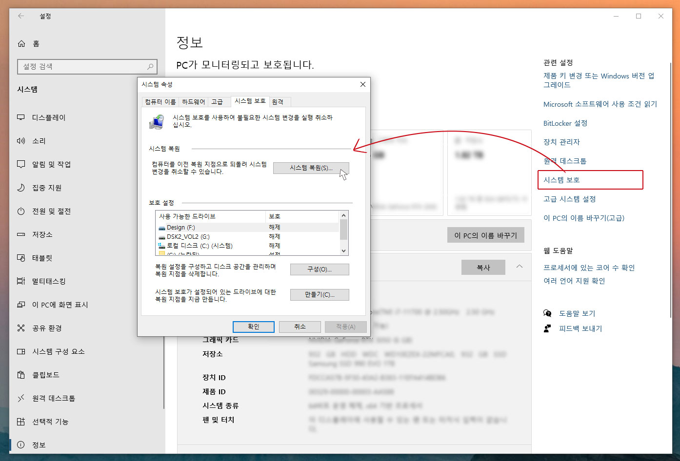 참고: 시스템 복원은 시스템 파일, 레지스트리, 설치된 프로그램을 복원 지점 시점으로 되돌리지만, 개인 파일(문서, 사진 등)에는 영향을 주지 않습니다.
